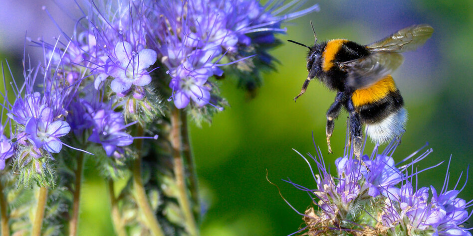 (IMG) Bild: Eine Hummel landet auf den Blüten einer Phacelia-Pflanze, auch „Bienenfreund“ genannt