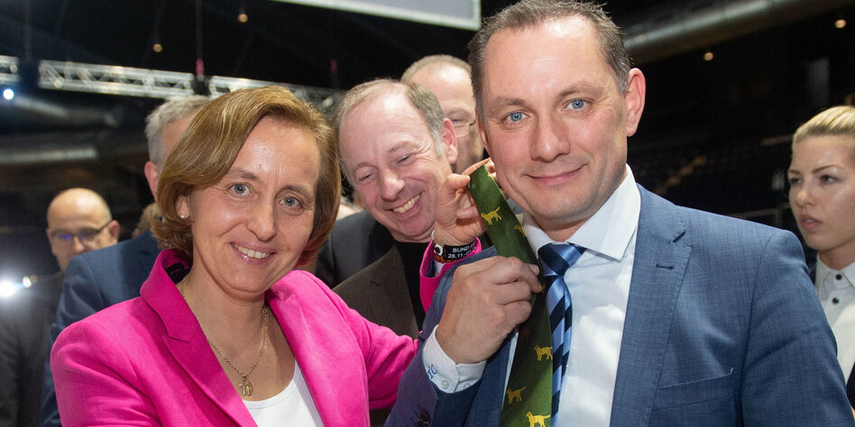 (IMG) Bild: Die Hundekrawatten-Tradition muss weitergehen: Tino Chrupalla kriegt jetzt auch eine