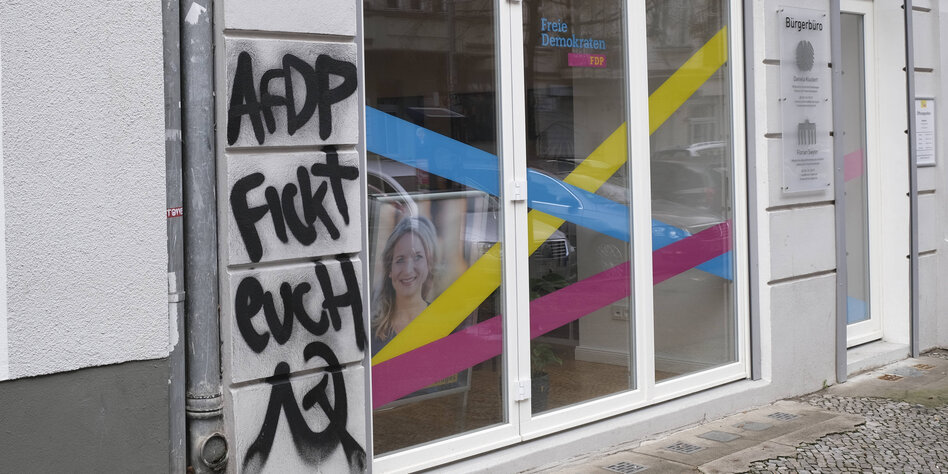 sind Landesgeschäftsstellen der FDP mit Parolen beschmiert und beschädigt