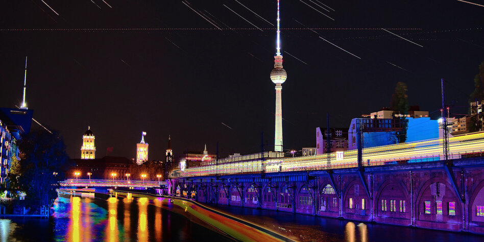 (IMG) Bild: Links und rechts des Flusses wummern die Bässe. Die Spree nahe der Jannowitzbrücke