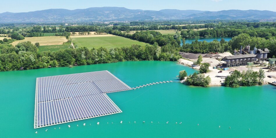 (IMG) Bild: Schwimmende Photovoltaik Anlage auf einem Baggersee in Baden-Württemberg