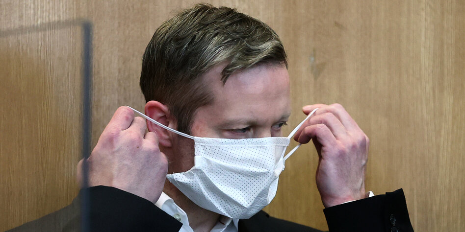(IMG) Bild: Stephan Ernst nimmt sich im Gerichtssaal des Oberlandesgerichts Frankfurt den Mund-Nasen-Schutz ab