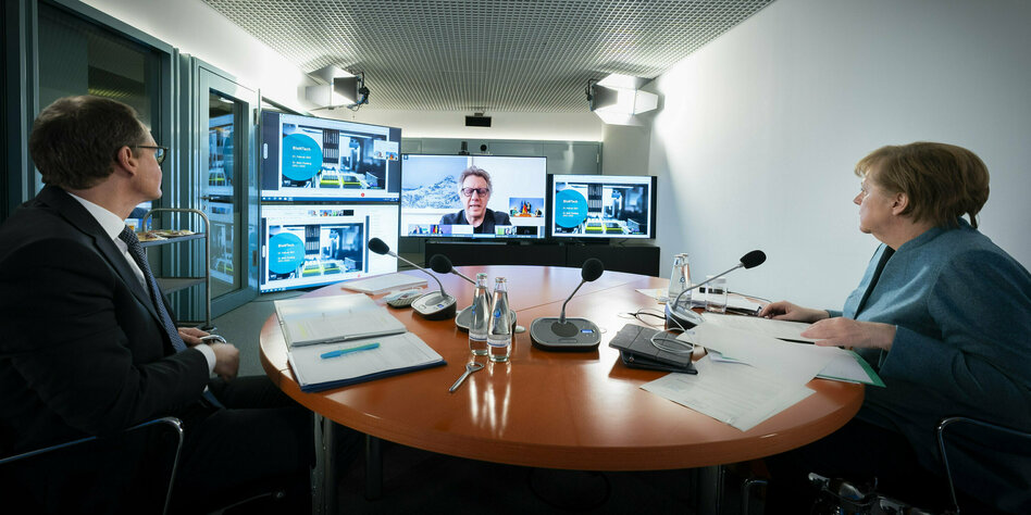 (IMG) Bild: Merkel und Müller am Tisch, der Finanzvorstand von Biontech in der Videoschalte