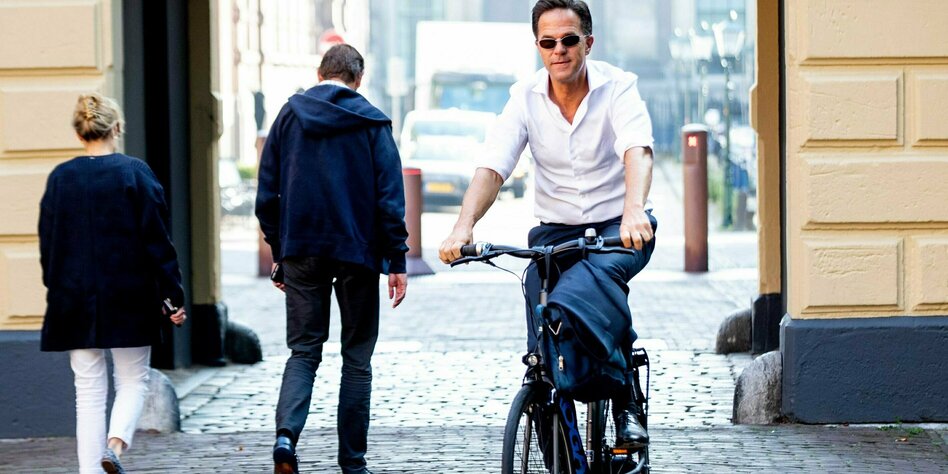 (IMG) Bild: Der Wahlsieger kam mit dem Rad ins Wahllokal: Premierminister Mark Rutte