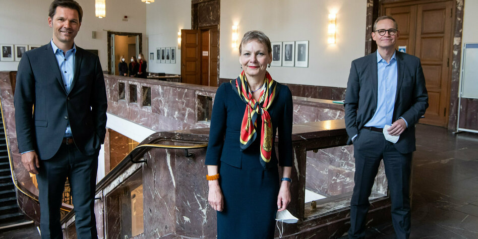(IMG) Bild: Regierungschef Müller (r.), HU-Chefin Kunst und Staatssekretär Krach kündigten Uni-Lockerungen vor