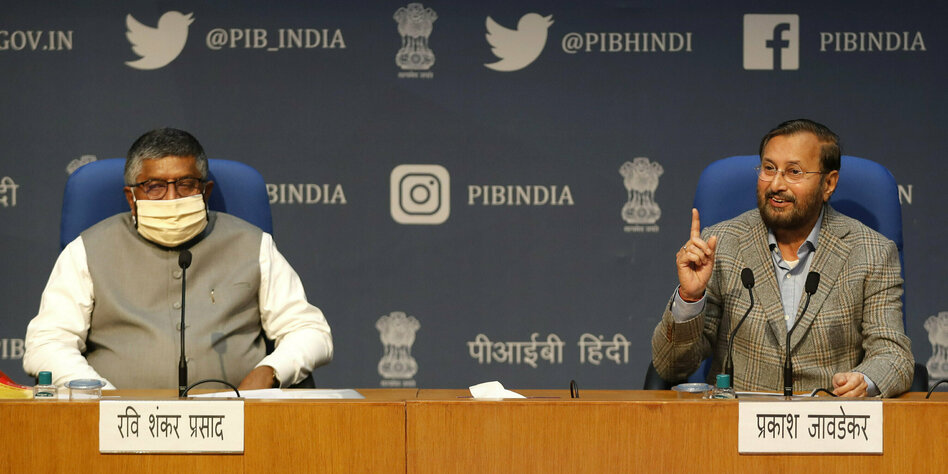 (IMG) Bild: Die Minister Prasad (l.) und Javadekar (r.) verkündeten am 16. Juni neue Social-Media-Regelungen