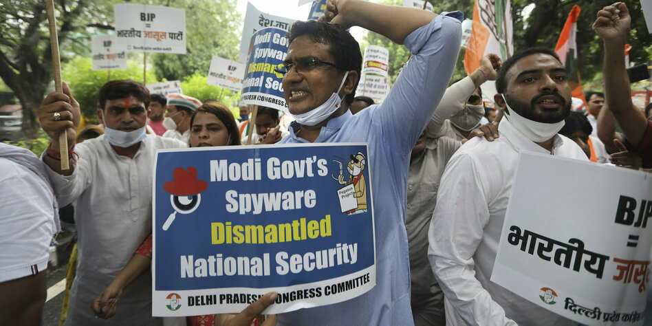(IMG) Bild: Mitarbeiter der Kongress-Partei protestieren in Neu Delhi gegen den Einsatz der Spionagesoftware