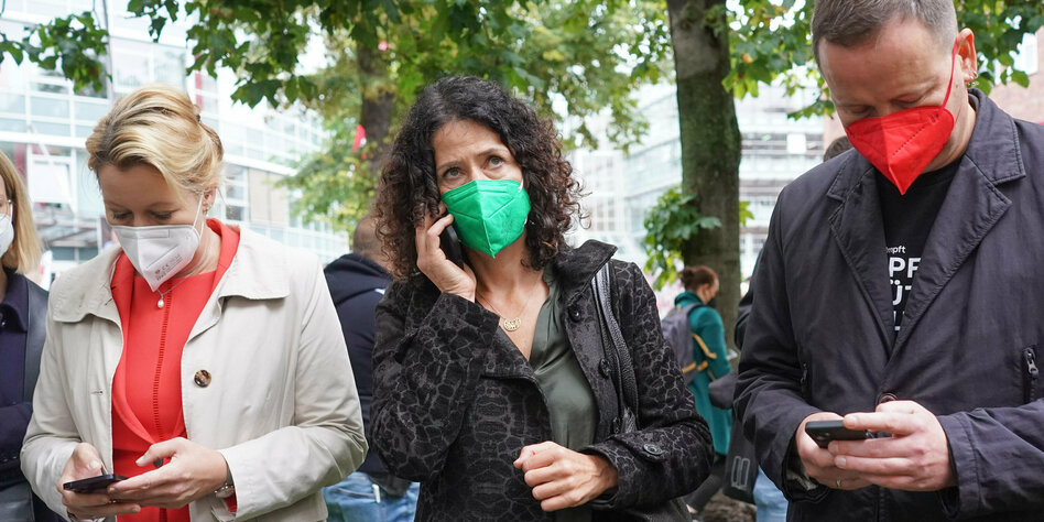 (IMG) Bild: Wenn's ums Handy geht, passt kein Blatt zwischen die drei: Giffey, Jarasch und Lederer am Montag