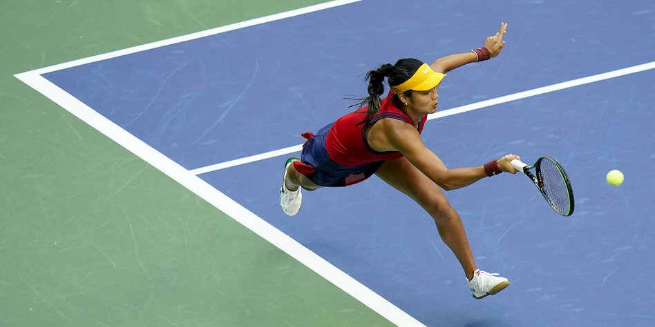 (IMG) Bild: Neues Tempo: Emma Raducanu erreicht einen Ball von Leylah Fernandez