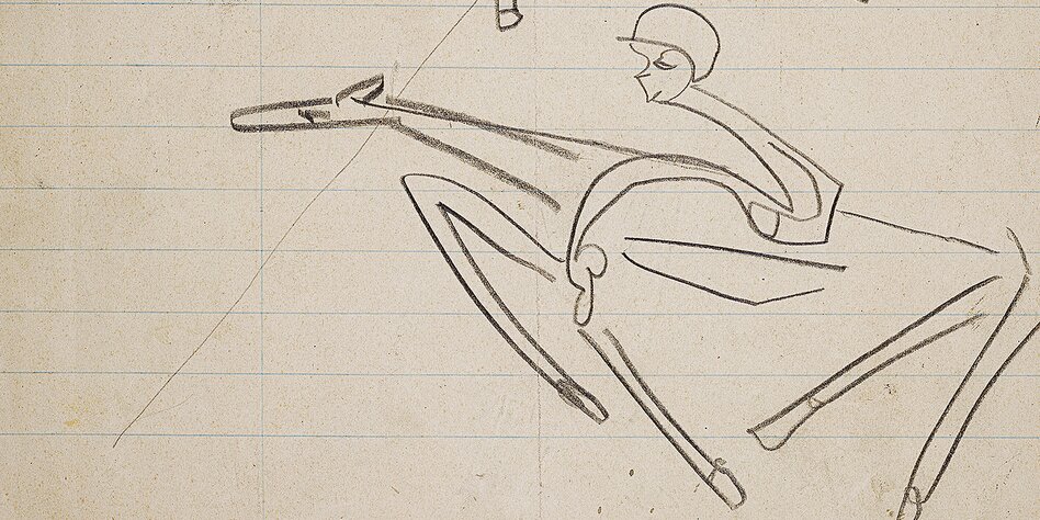 (IMG) Bild: Pferd mit Jockey von Franz Kafka mit Bleistift auf liniertes Blatt gezeichnet, Ausschnitt