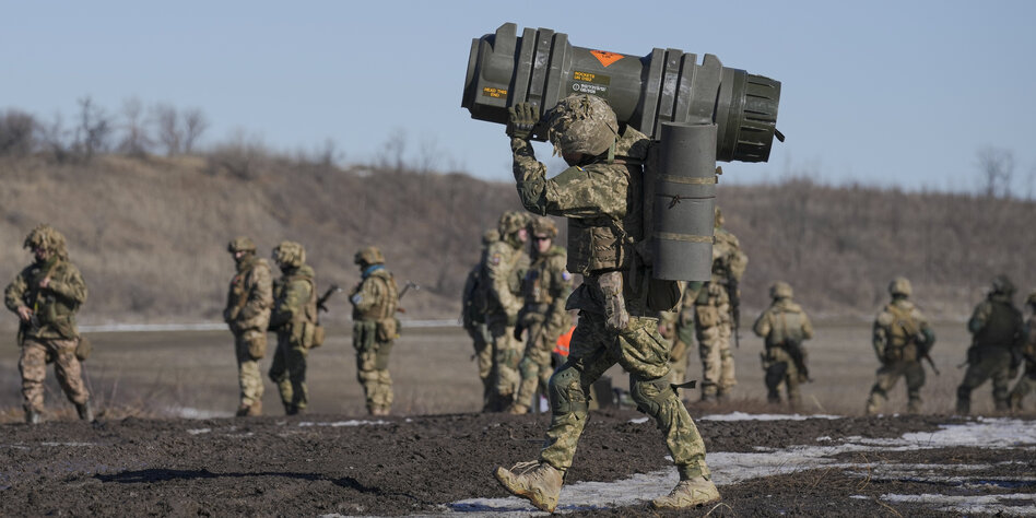 (IMG) Bild: Ein ukrainischer Soldat trägt eine NLAW-Panzerabwehrlenkwaffe; 15.02