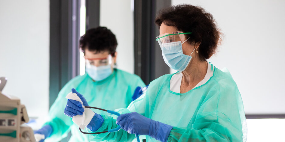 (IMG) Bild: Patientenferne Tätigkeit: Reinigungskräfte desinfizieren Geräte am Uniklinikum Freiburg