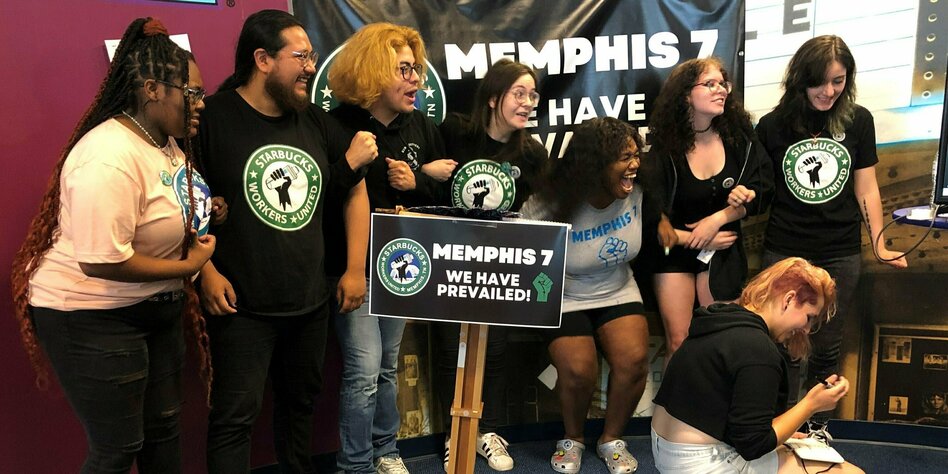 (IMG) Bild: Wurden als „Memphis 7“ bekannt: die entlassenen Starbucks-Beschäftigten nach dem Sieg vor Gericht