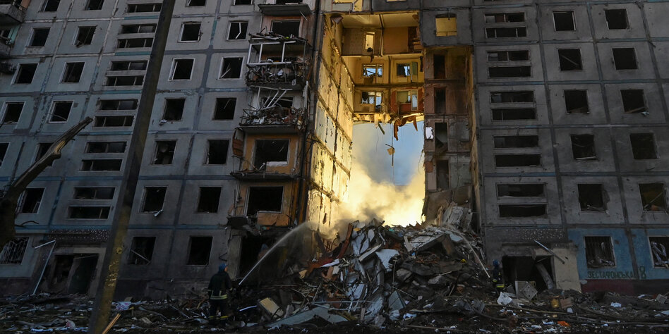 (IMG) Bild: Ein Wohnhaus in Saporischschja nach dem Angriff in der Nacht