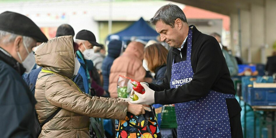 Schürze der Münchner Tafel für die Kameras posiert]. Söder verteilt