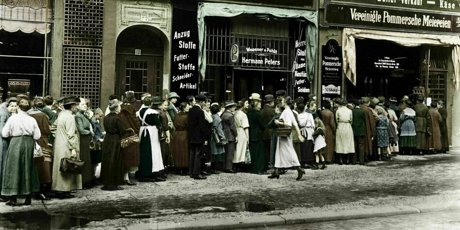 (IMG) Bild: Auch das gehörte zum Stadtbild Berlins in den 1920er Jahren: Schlange stehen vor Geschäften
