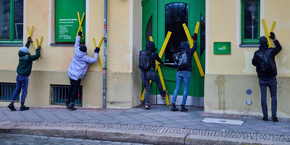 Klimaschützer:innen protestierend vor die Grünenzentrale, bringen dort