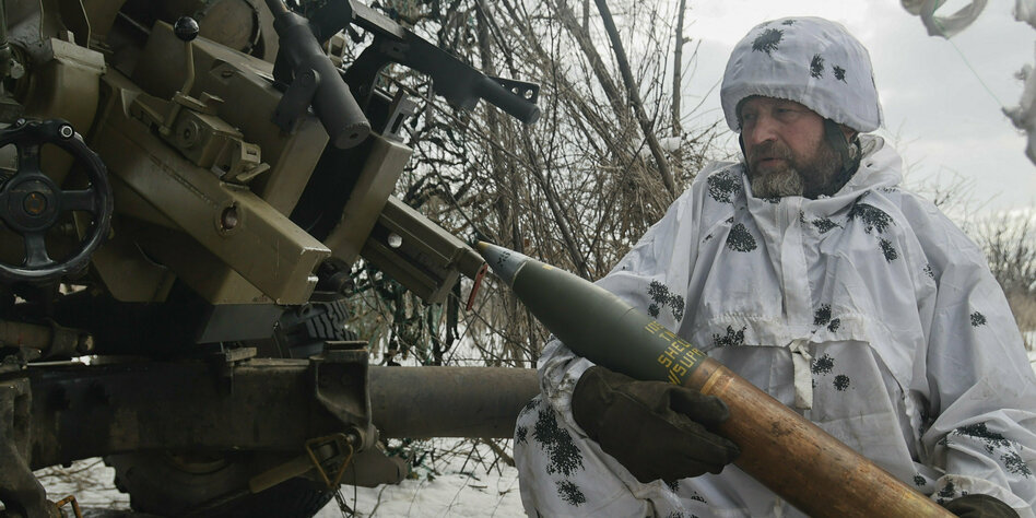 (IMG) Bild: Brutale Kämpfe um Bachmut, ein ukrainischer Soldat lädt Atillerie nach, 15. Februar