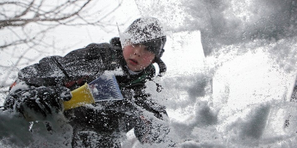 (IMG) Bild: Ein Junge kratzt Eis von einer Autoscheibe