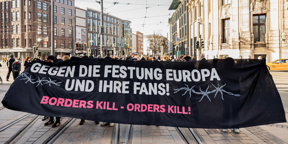 (IMG) Bild: Gäbe es keine Grenzen, bräuchte niemand Papiere … Demo in der Bremer Innenstadt, Februar 2022