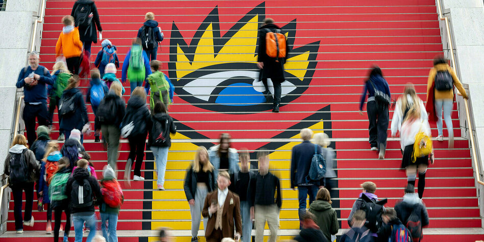 (IMG) Bild: Leipzig, am 27. April: Besucher:innen auf dem Weg zum Messegelände