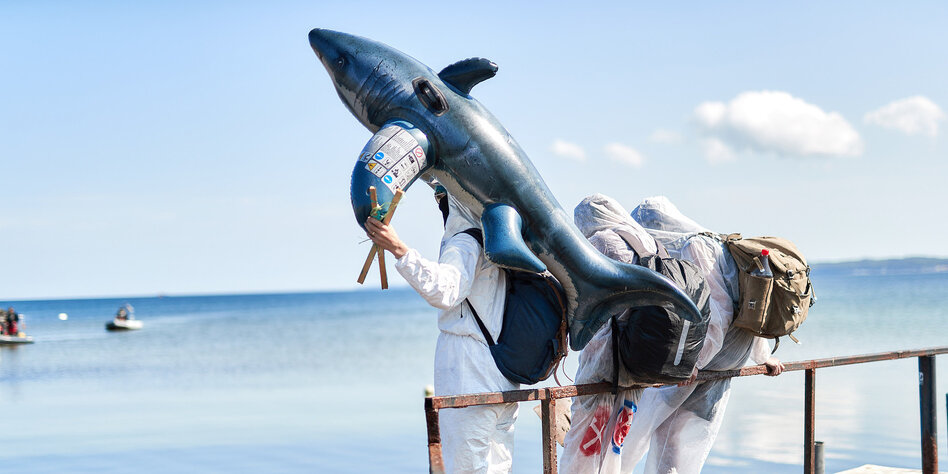 (IMG) Bild: Hai gegen LNG: Klimaaktivist*innen demonstrieren auf Rügen gegen den Bau eines LNG-Terminals