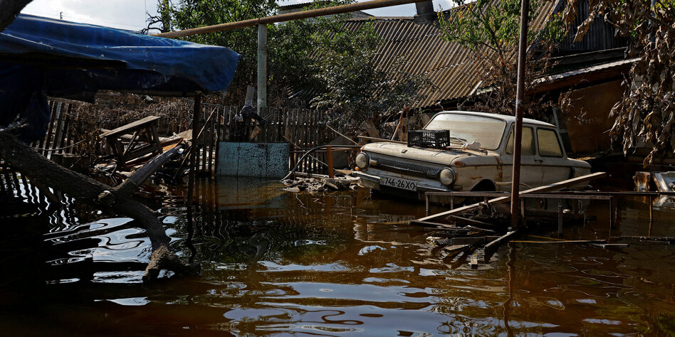 (IMG) Bild: Ein Auto im Wasser – nach der Zerstörung des Staudamms in der Ostukraine derzeit Alltag