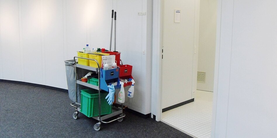 (IMG) Bild: Putzwagen vor einer Toilettentür: Den gesetzlichen Mindestlohn gibt es seit 2015 in Deutschland
