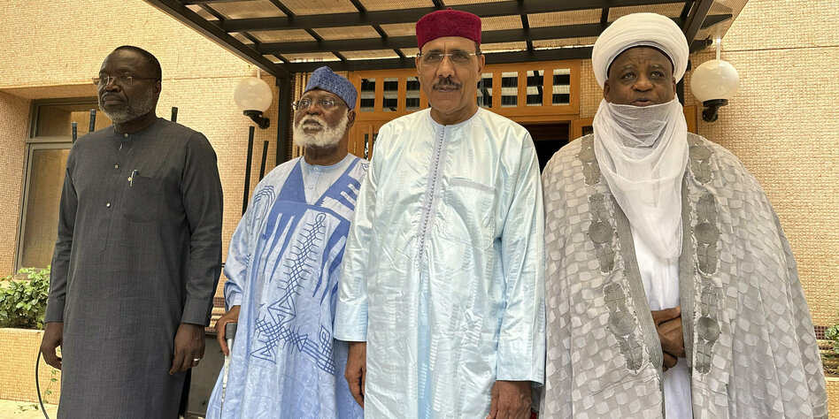 (IMG) Bild: Letztes öffentliches Bild: Mohamed Bazoum im Hausarrest mit Vermittlern aus Nigeria, 19. August