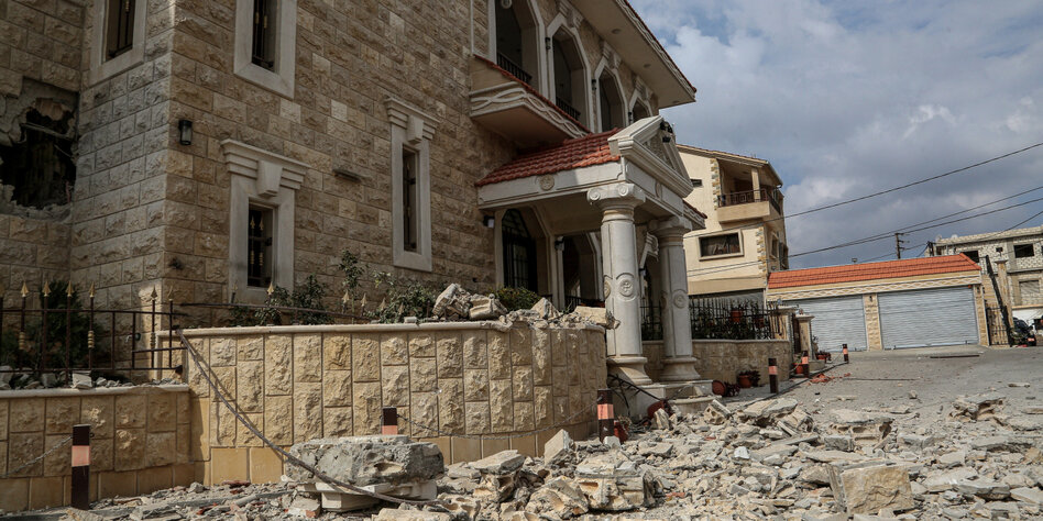 (IMG) Bild: Ein Blick auf ein beschädigtes Haus, das von israelischen Raketen im südlibanesischen Grenzdorf Dhayra direkt getroffen wurde. Offiziell nicht im Krieg, aber trotzdem unter Beschuss: Tausende Menschen im Grenzgebiet zwischen Israel und Libanon mussten ihre Häuser wegen Kampfhandlungen evakuieren