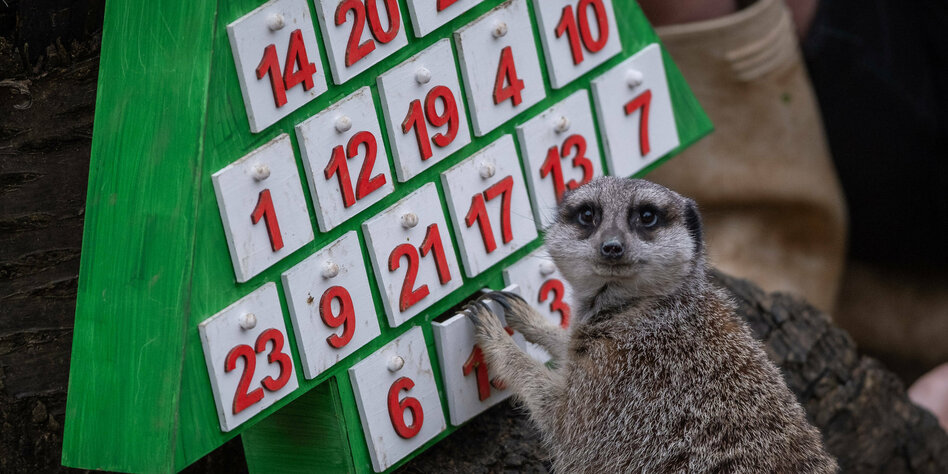 (IMG) Bild: Ein Erdmännchem im Londoner Zoo öffnet ein Adventskalendertürchen