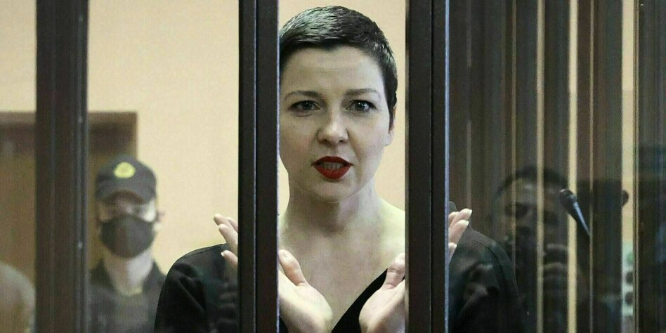 (IMG) Bild: Die belarussische Oppositionsaktivistin Maria Kolesnikowa erscheint in Handschellen vor Gericht im September 2021