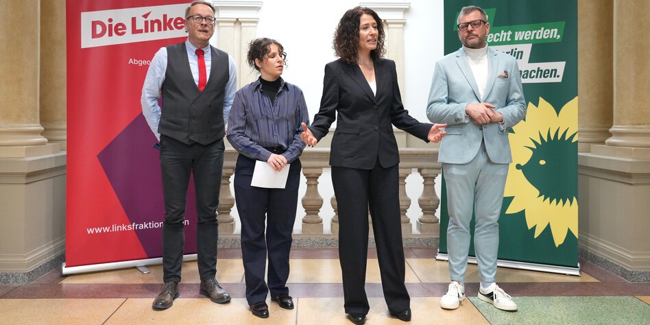 (IMG) Bild: Mangels Haushaltsdebatte präsentierten Grüne und Linkspartei ihre Kritik an Schwarz-Rot ein paar Meter neben dem Plenarsaal