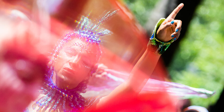 (IMG) Bild: Eine Darstellerin in Aktion beim Karneval der Kulturen 2023