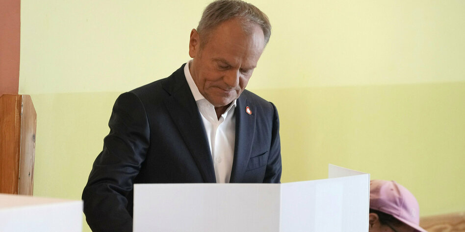 (IMG) Bild: Polens Premier Donald Tusk gibt seine Stimme für das Europäische Parlament am Sonntag in Warschau ab