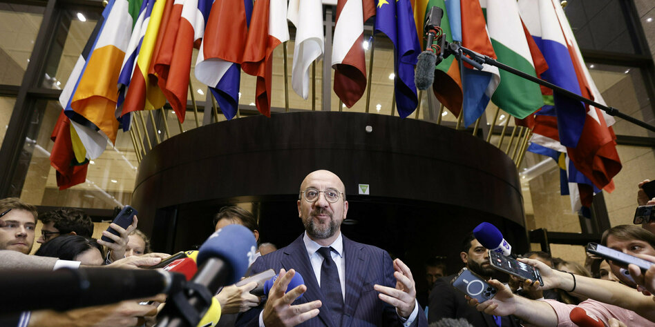 (IMG) Bild: Brüssel, 17. Juni: der amtierende EU-Ratspräsident Charles Michel spricht mit der Presse