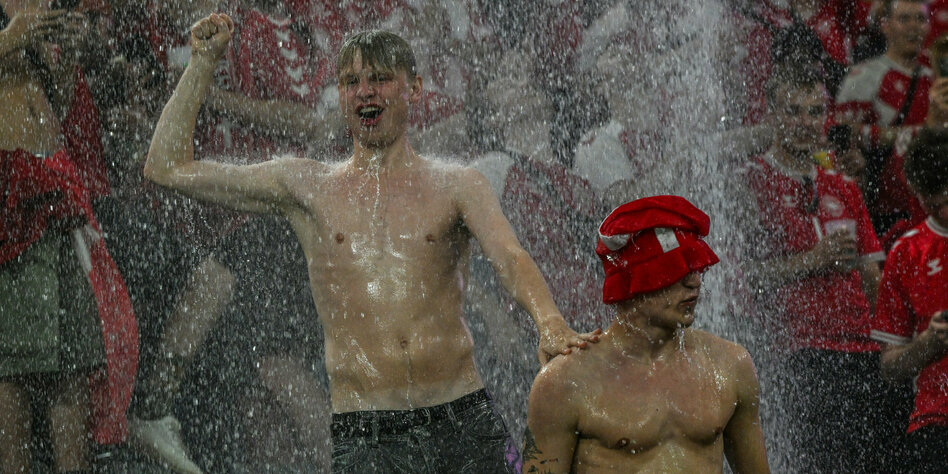 (IMG) Bild: Praktisch: Für diese dänischen Fans gab es im Stadion wegen des Starkregens eine kostenlose Dusche