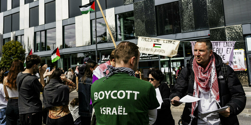 (IMG) Bild: Protest vor der Universität in Lausanne im Mai 2024, die Studierenden fordern u.a den Boykott israelischer Einrichtungen