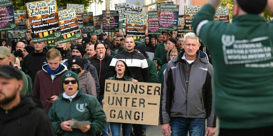 (IMG) Bild: Was die Anhänger der Kleinpartei Dritter Weg von der EU halten, zeigen sie deutlich: Demonstration im Oktober 2022