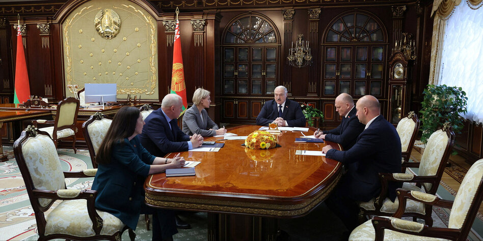(IMG) Bild: Alexander Lukaschenko und weitere Beteiligte bei Verhandlungen zum Fall Rico K. in Minsk (30. Juli 2024)