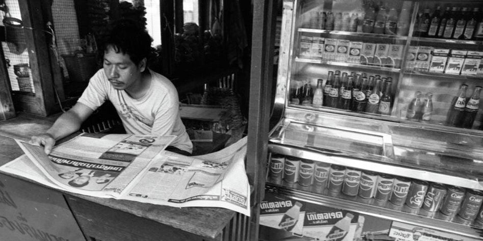 (IMG) Bild: Nicht viel los, Zeit zum Zeitunglesen: Ein thailändischer Verkäufer in den 80ern