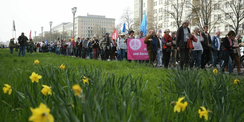 (IMG) Bild: Ostermarsch in Berlin 2024, die TeilnehmerInnen fordern einen Waffenstillstand in Gaza und der Ukraine