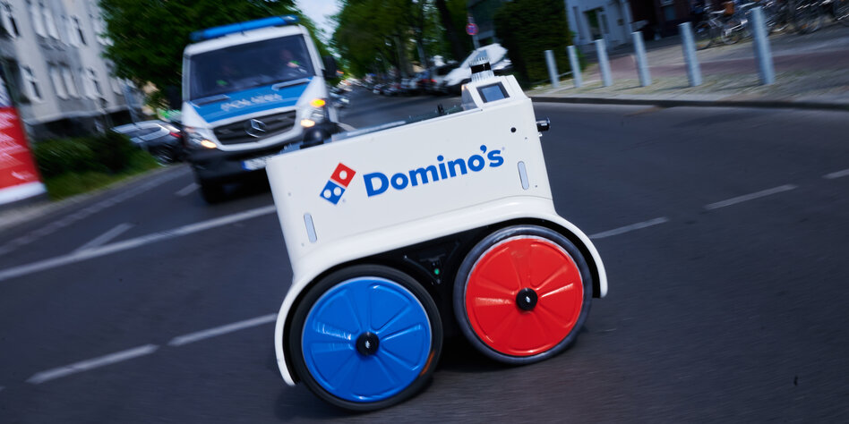 (IMG) Bild: Der will gar keinen Lohn: Ein Roboter der Firma Dominos fährt während einer Präsentationsfahrt durch Charlottenburg (2022)
