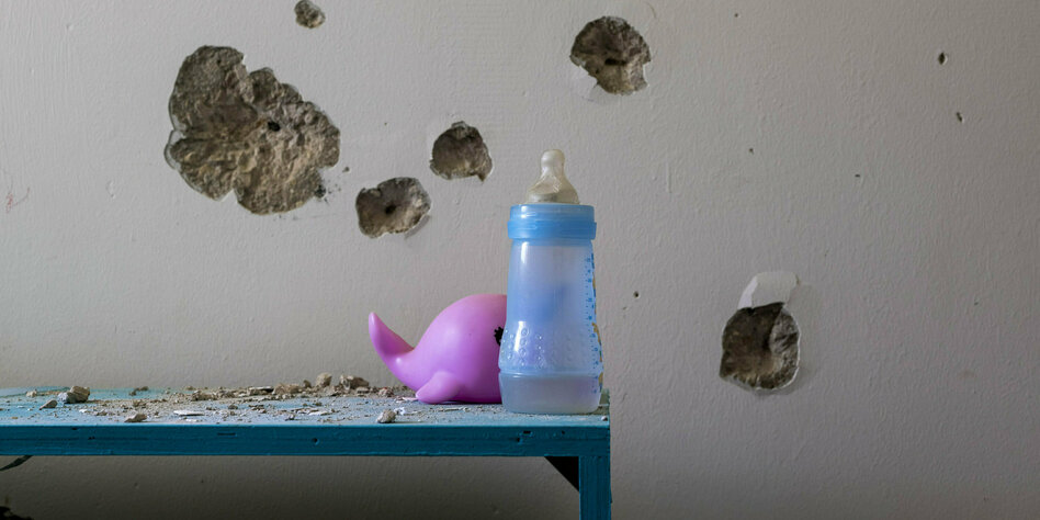 (IMG) Bild: Aus der Serie: leere Schlafzimmer. Einschusslöcher im Zimmer des von der Hamas gekidnappten Ariel Bibas aus dem Kibbuz Niz Oz