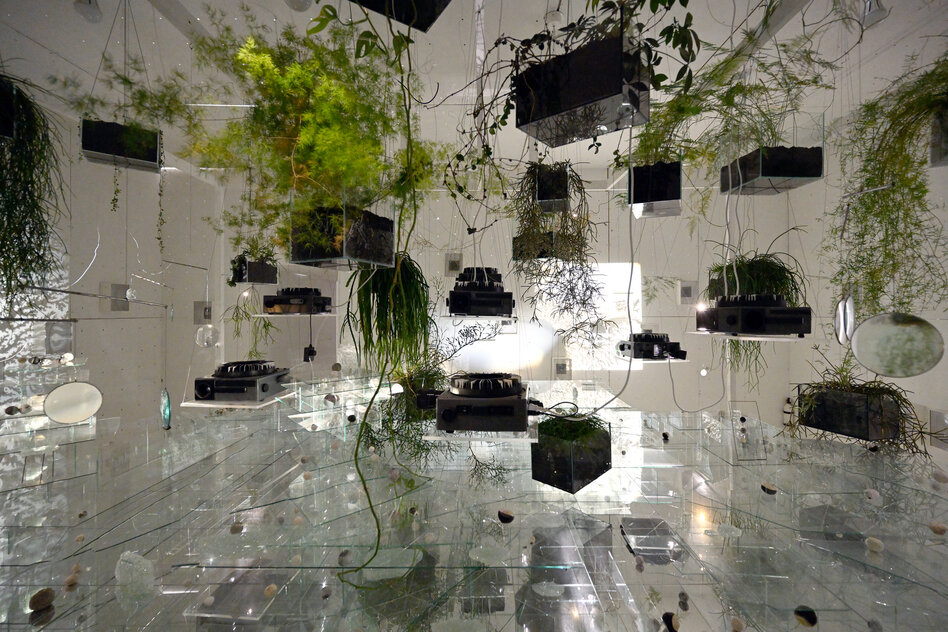 (IMG) Bild: Alles in Bewegung: Überall rattert, blinkt und rieselt es im pflanzen- und spiegelbesetzten „Glasraum“