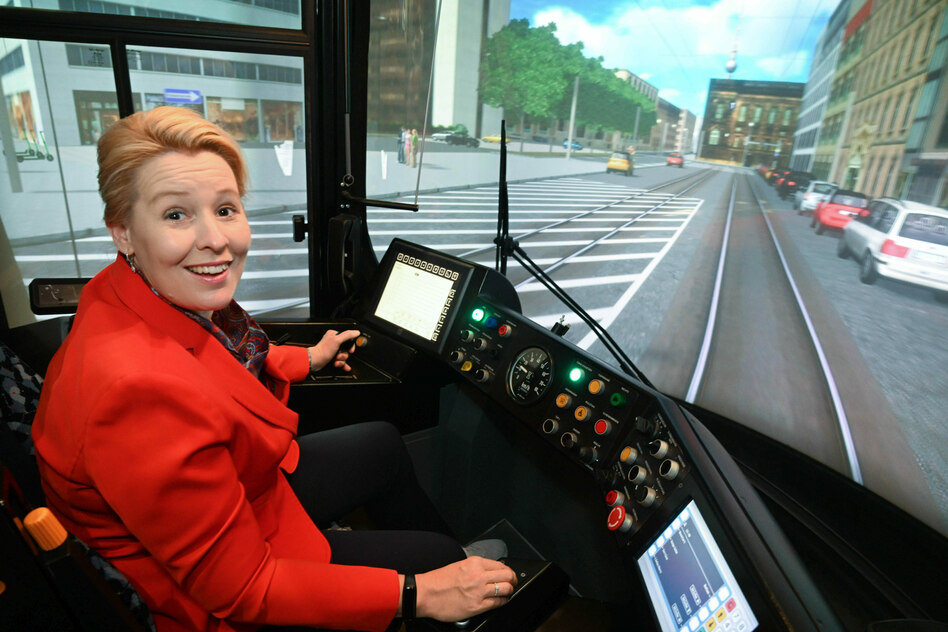 (IMG) Bild: Alles nur Simulation: Wirtschafts- und Betriebesenatorin Franziska Giffey (SPD) in einem Straßenbahn-Simulator