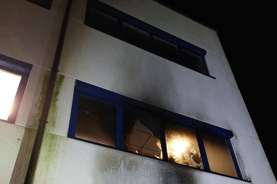 Scheiben eingeschlagen und Brandsätze ins Gebäude geworfen. Der Brand