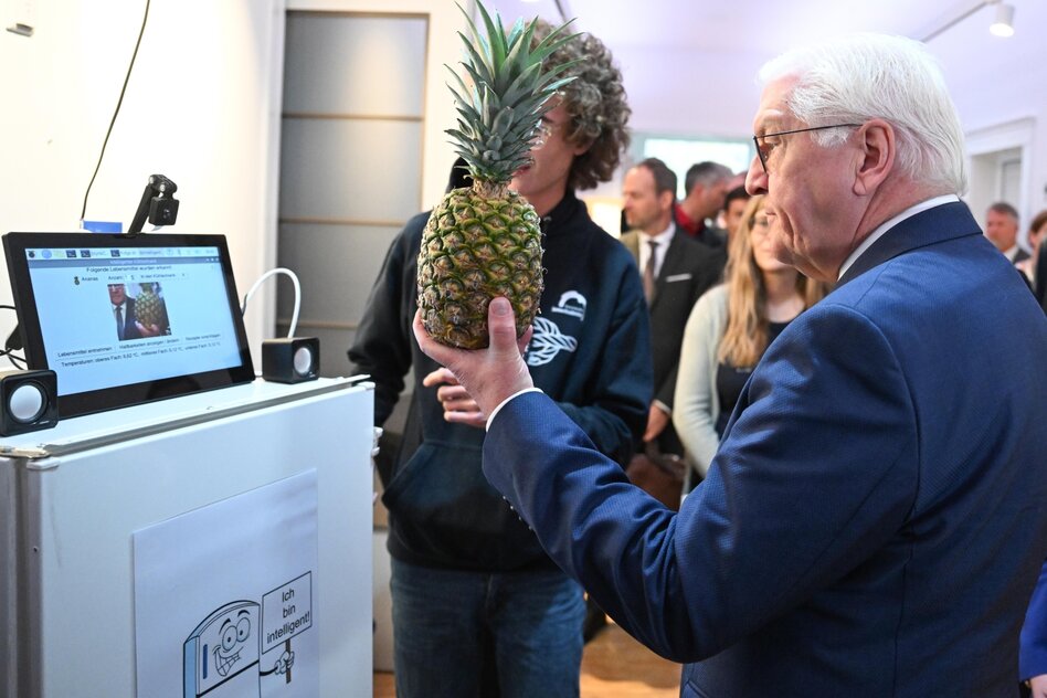 (IMG) Bild: Bundespräsident Frank-Walter Steinmeier mit KI-Kühlschrank und Ananas