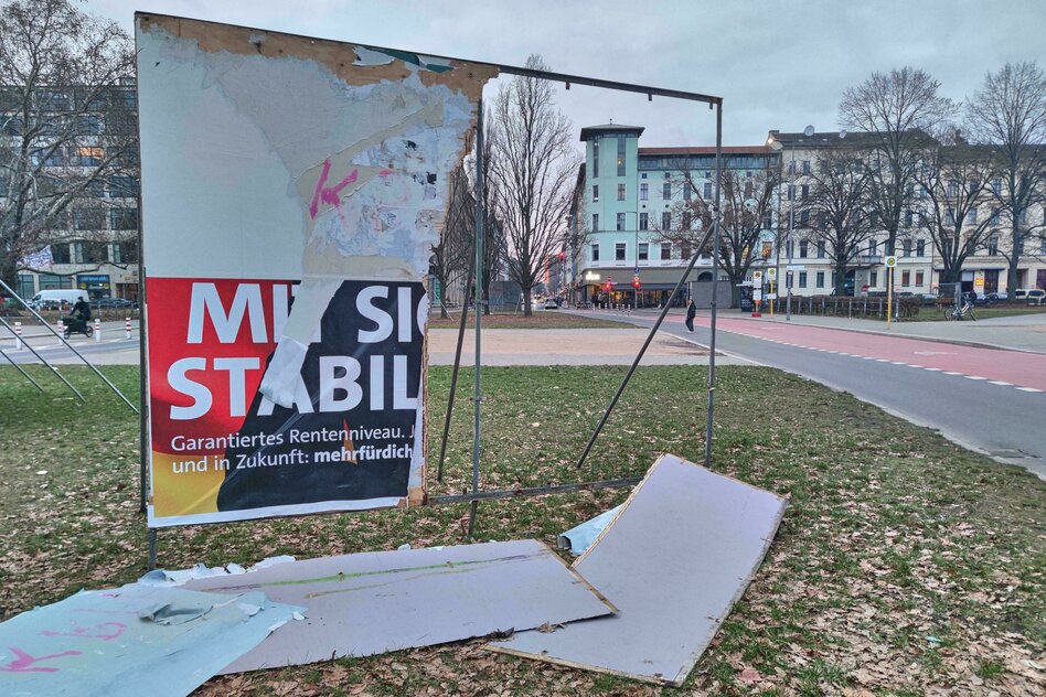 (IMG) Bild: Oranienplatz, Berlin-Kreuzberg: zerstörtes SPD-Wahlplakat zur Bundestagswahl
