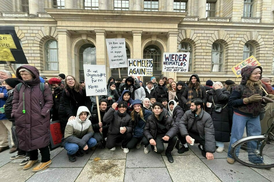 (IMG) Bild: Bewohner*innen und Mitarbeiter*innen des Jugendwohnen Urban demonstrieren vor dem Abgeordnetenhaus